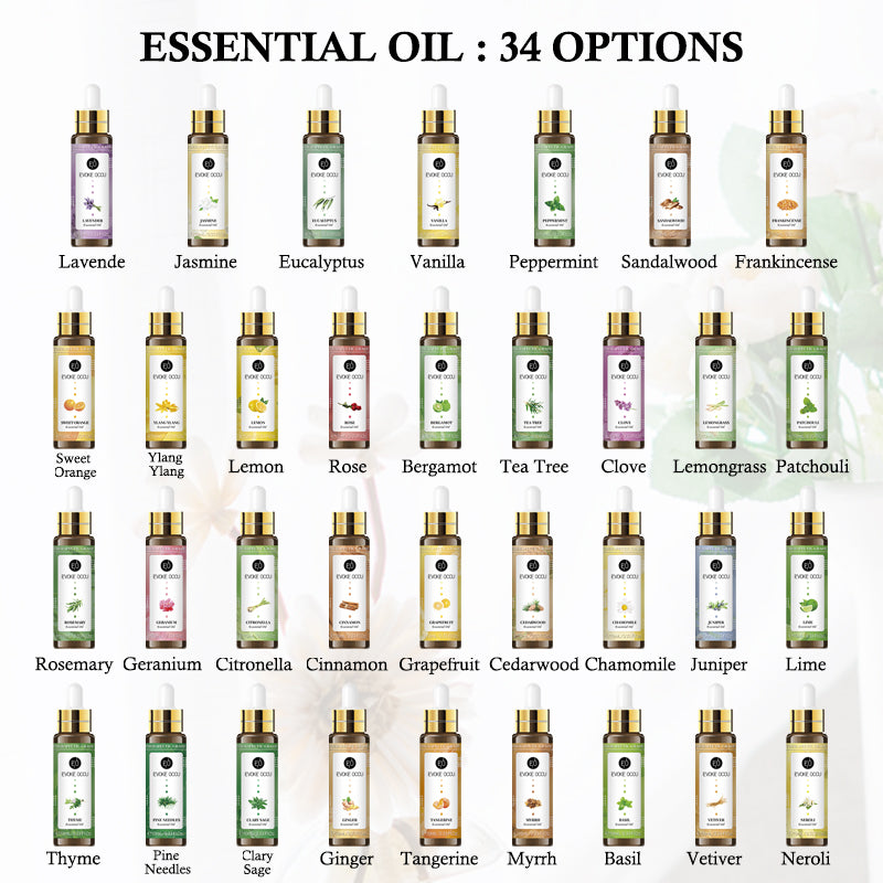 Ingredients: rose, sandalwood, lavender, tea tree, chamomile, lemon, rosemary, geranium, mint, eucalyptus, jasmine, ylang-ylang, bergamot, sage, Sweet&Orange, lemongrass, basil, Orange blossom, jasmine, ginger, frankincense, ginger, patchouli, vetiver, juniper, myrrh, lemongrass, grapefruit, cedar, sweet orange, thyme, lime, pine needles, cloves, vanilla, thyme